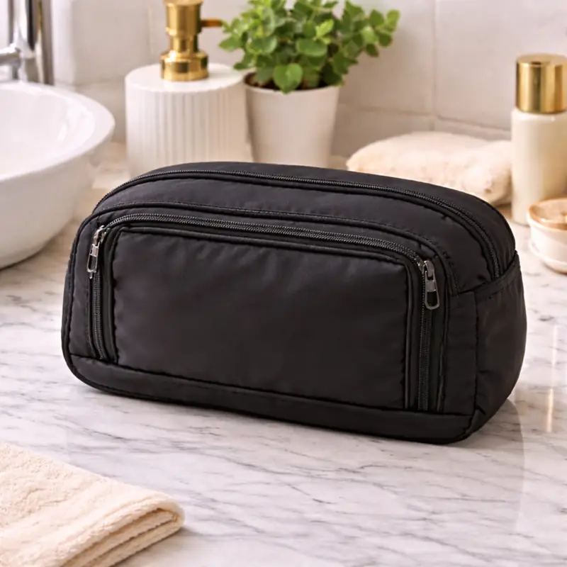 Pochette di colore nero dal design compatto e strutturato, dotata di più zip e doppio vano principale. Ideale come beauty case, borsa da toilette o trousse da viaggio, è pensata per chi vuole organizzare con ordine cosmetici, accessori e prodotti da bagno.