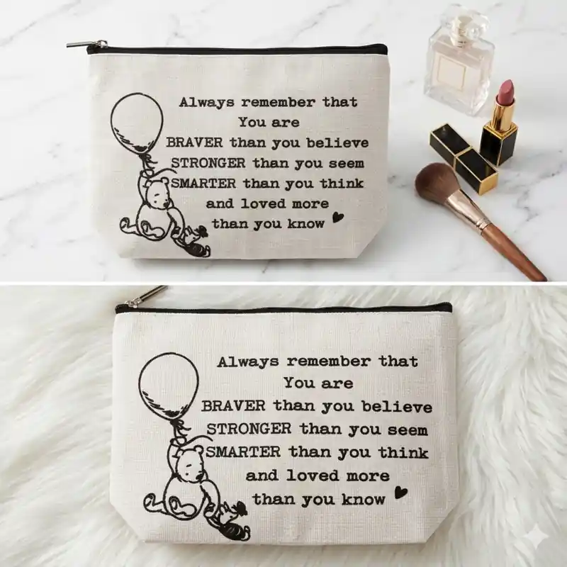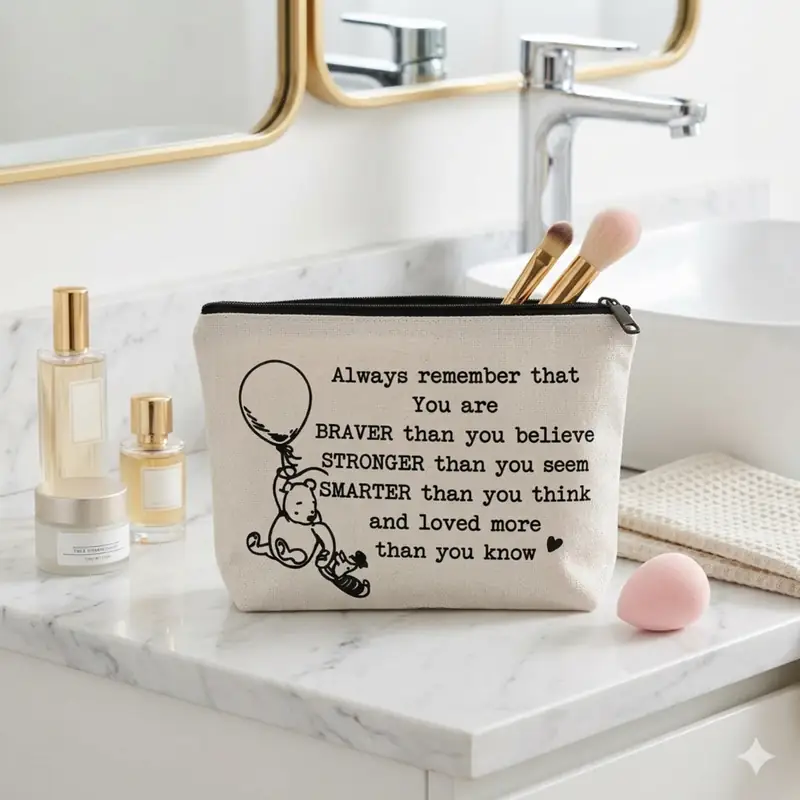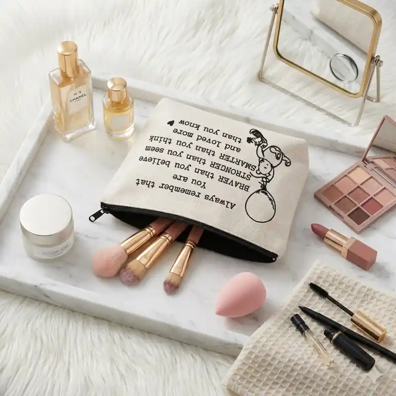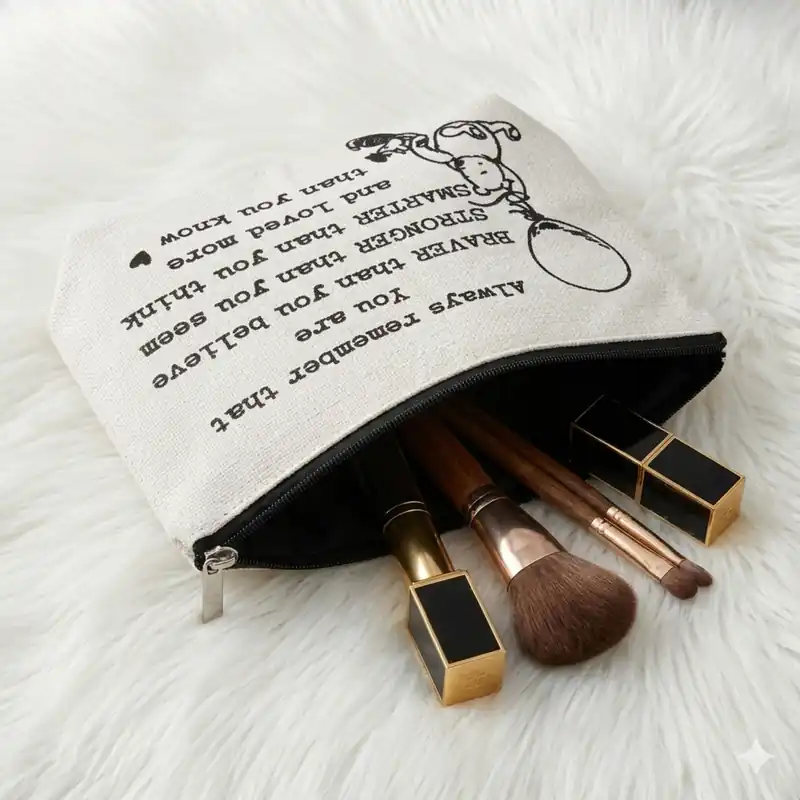 Questa pochette motivazionale di colore beige ha un design pulito e delicato, valorizzato da una frase motivazionale stampata in grande evidenza. L’insieme resta semplice, ma il testo rende il prodotto molto più personale di una classica trousse neutra.