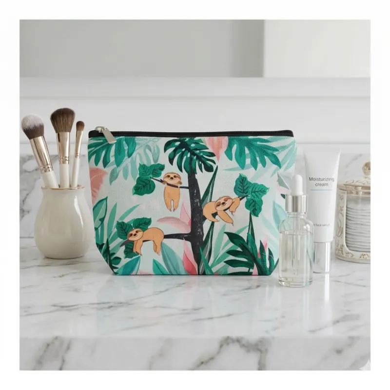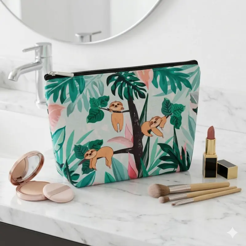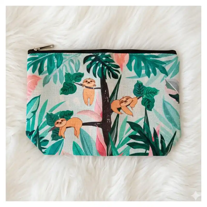 L’elemento che la rende davvero unica è proprio il soggetto. Il bradipo richiama un immaginario di calma, relax e leggerezza, e trasforma questa pochette in un accessorio simpatico ma anche molto identificabile a colpo d’occhio. La composizione con rami, foglie tropicali e piccoli bradipi crea una scena dinamica e decorativa, diversa dalle classiche trousse a tinta unita o con semplici scritte frontali.