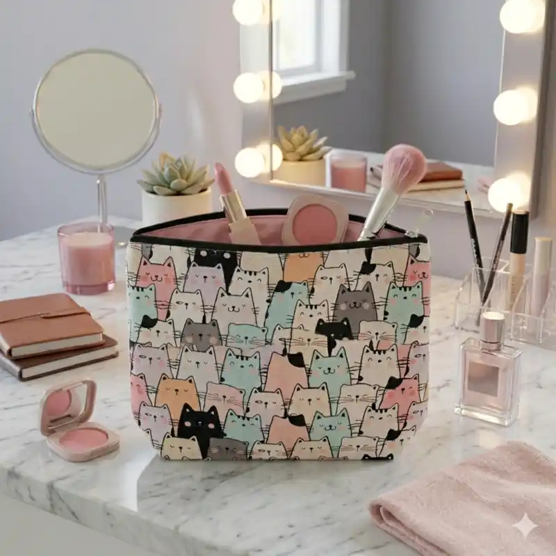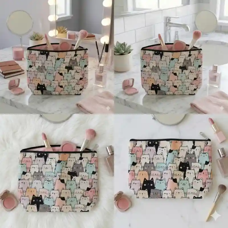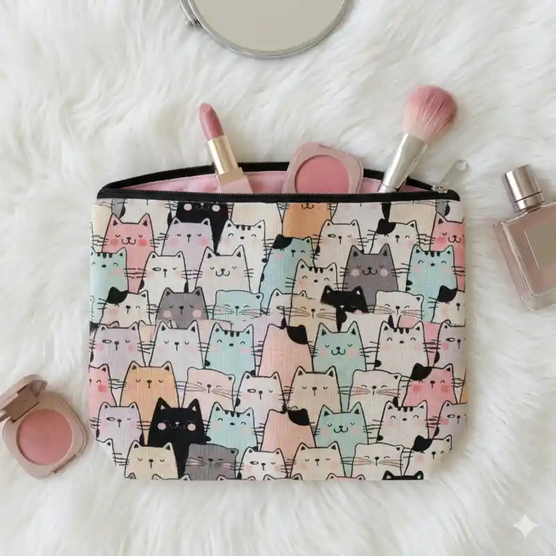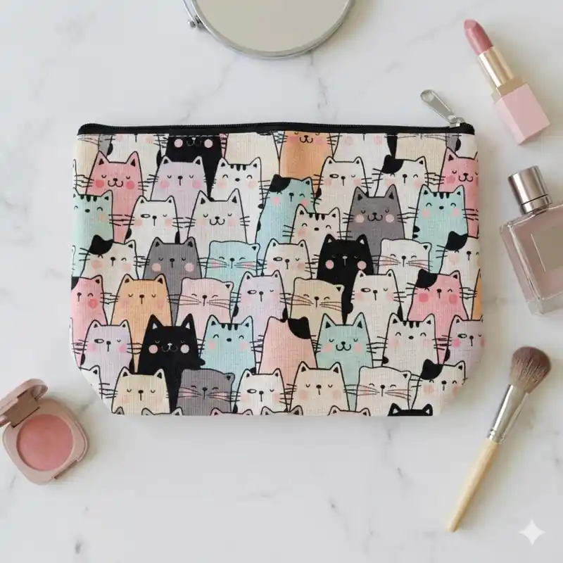 L’elemento che la rende davvero unica è proprio il modo in cui i gatti sono rappresentati. Le figure sono stilizzate, frontali e ravvicinate tra loro, quasi a creare un piccolo “muro” di musetti curiosi che guardano verso chi osserva la pochette. Questo effetto rende il prodotto molto più originale rispetto alle classiche trousse con una sola immagine centrale, perché qui la fantasia diventa il vero protagonista del design.