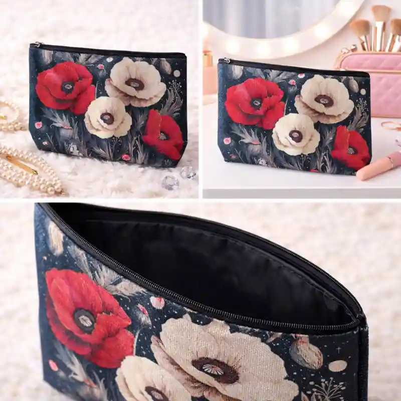Pochette Floreale Nera con Fiori Rossi e beige con zip | Beauty Case Elegante per chi ama i motivi floreali eleganti e decorativi