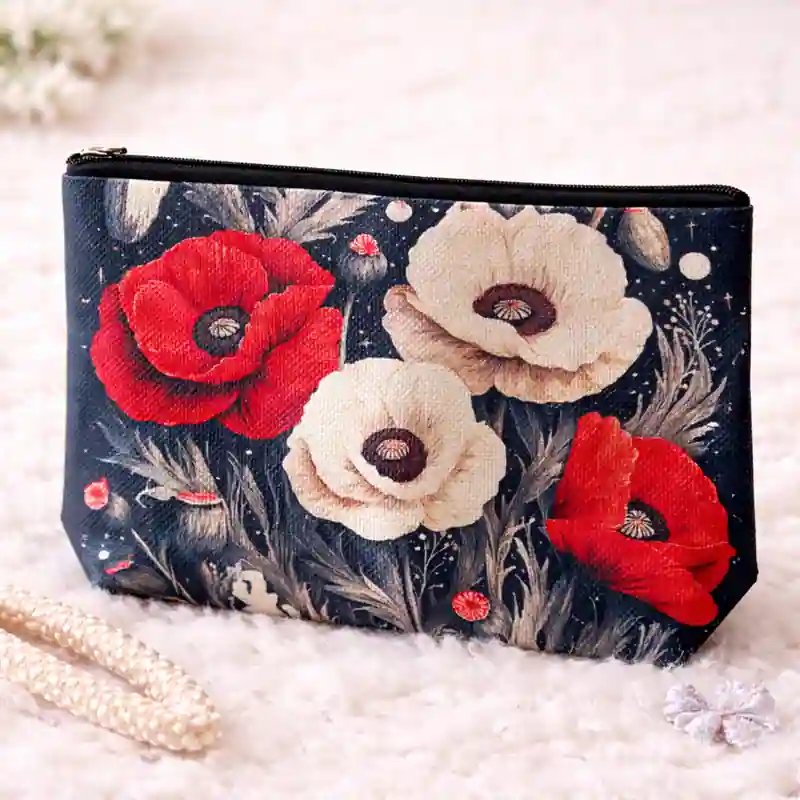 La stampa con grandi fiori rossi e beige rende infatti questa pochette  un accessorio decorativo, raffinato e perfetto per chi ama gli oggetti dal gusto più femminile e illustrato. È una variante ideale per chi cerca una pochette pratica ma anche decorativa, con una stampa più elegante e intensa rispetto ai classici motivi floreali leggeri.