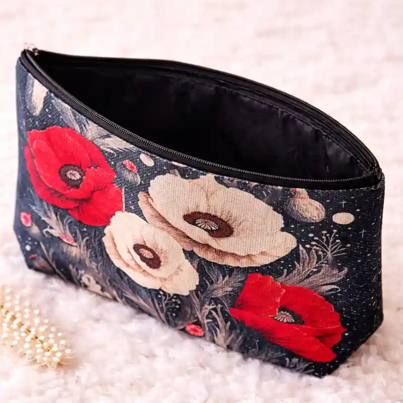 Pochette di colore nero con zip nera e stampa floreale con grandi fiori rossi e beige. Un beauty case elegante e decorativo, perfetto come trousse, borsa da toilette o pochette porta trucchi per chi cerca un accessorio raffinato e visivamente d’impatto.