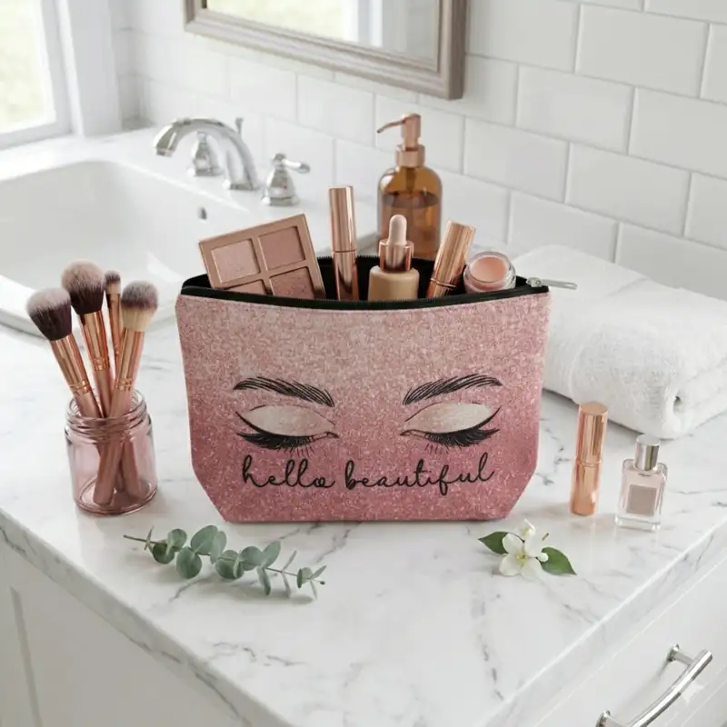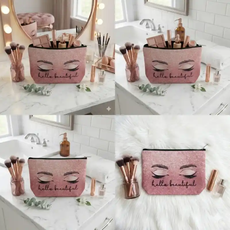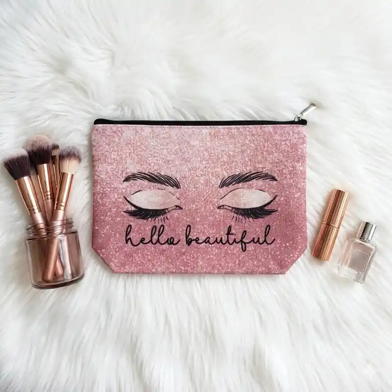 Questa pochette di colore rosa si distingue subito per la sua grafica frontale, costruita attorno a un’estetica beauty molto chiara e immediatamente riconoscibile. Al centro della pochette compaiono infatti occhi stilizzati con make up e la scritta hello beautiful (ciao bellissima), elementi che rendono il prodotto perfettamente coerente con il mondo trucco, cosmetici e cura personale.