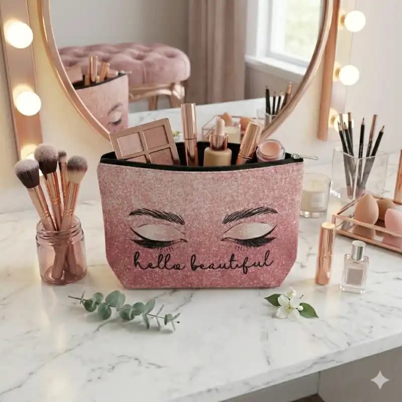 Si distingue perché è perfettamente coerente con il mondo beauty. Occhi truccati, la frase hello beautiful (ha un tono positivo, leggero e molto adatto a un accessorio da trucco) e colore lavorano tutti nella stessa direzione, creando un accessorio femminile, facile da riconoscere e pensato chiaramente per chi ama make up e cosmetici.