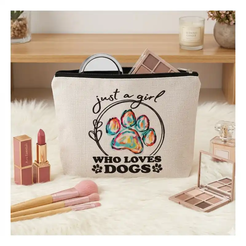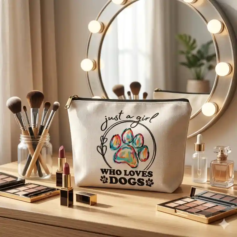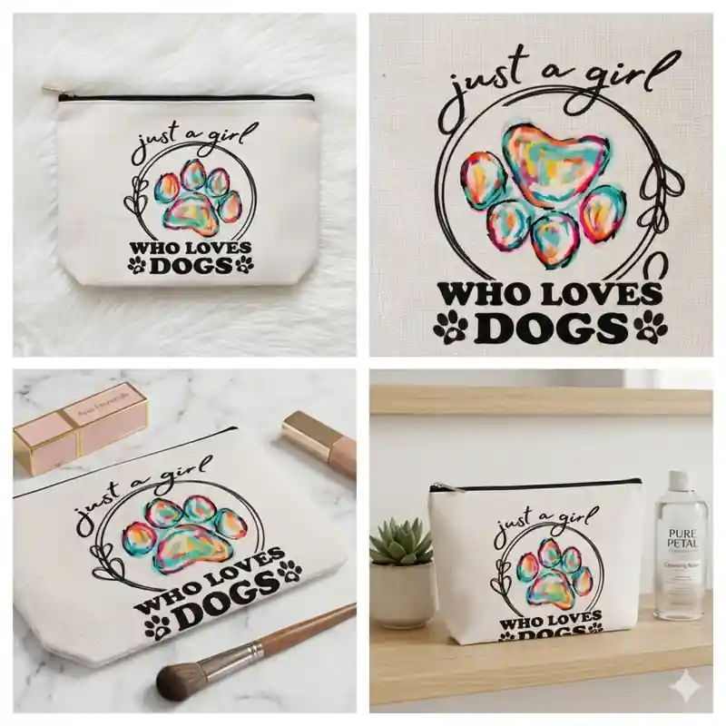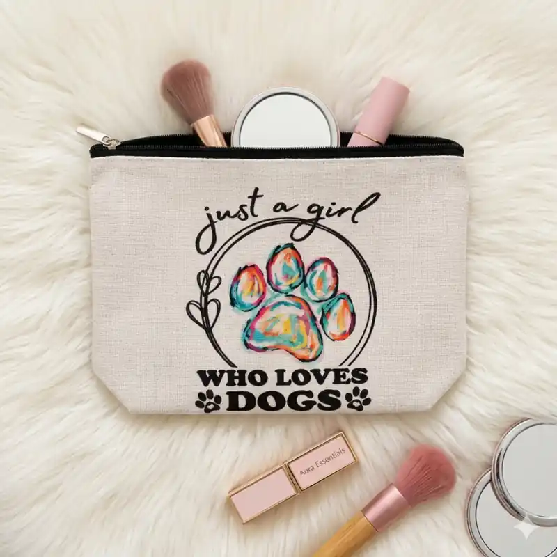 La scritta Just a Girl Who Loves Dogs con zampa centrale parla in modo molto chiaro a chi ama i cani e vuole un accessorio che lo dica senza bisogno di spiegazioni. In questo senso, questa pochette con zampa è molto più di una semplice trousse decorata: è una pochette che parla in modo diretto al mondo dog lover, senza bisogno di troppi elementi illustrativi.