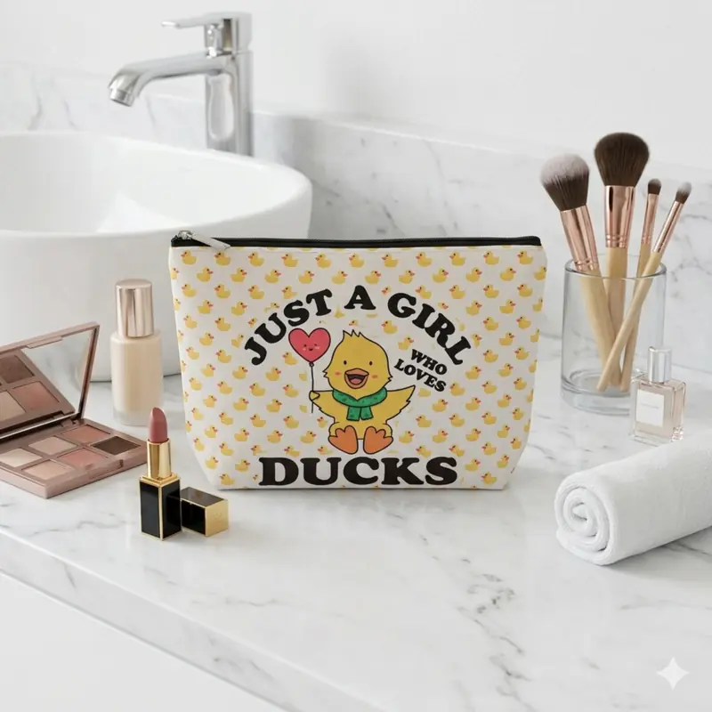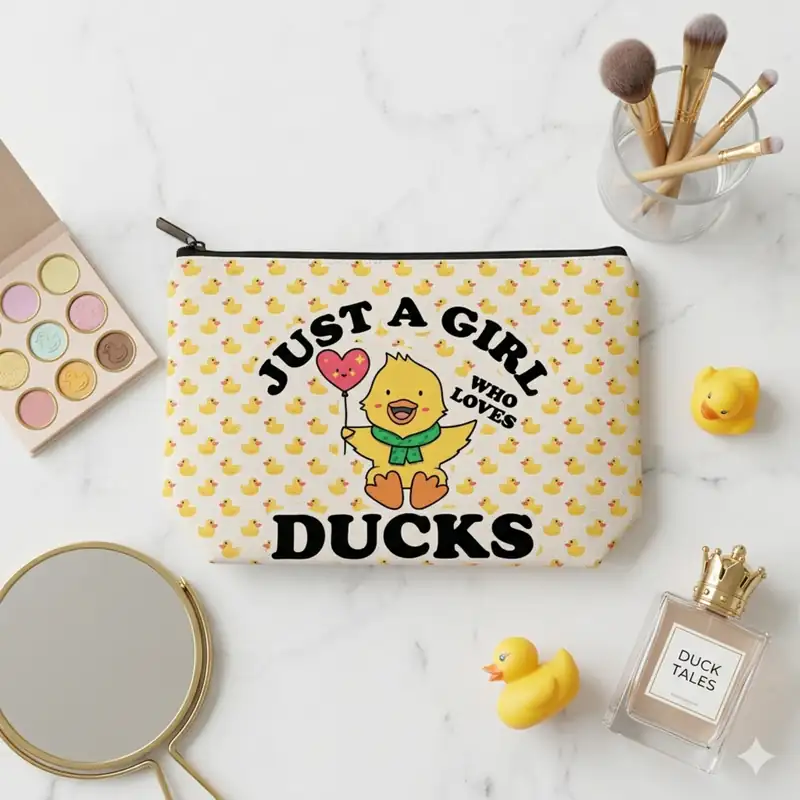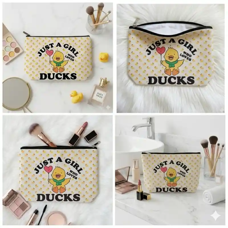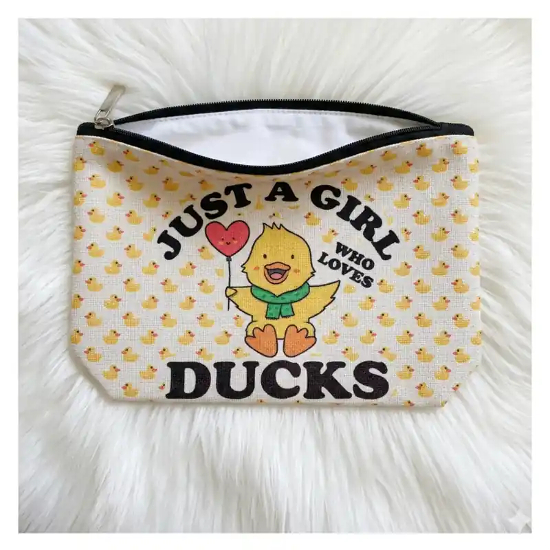 Questa pochette Just a Girl Who Loves Ducks è anche un’ottima idea regalo per chi ama le paperelle, perché unisce utilità e grafica in modo semplice e immediato.