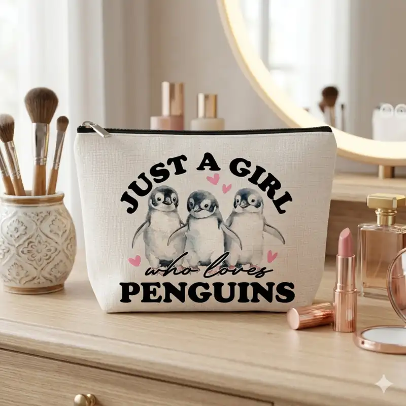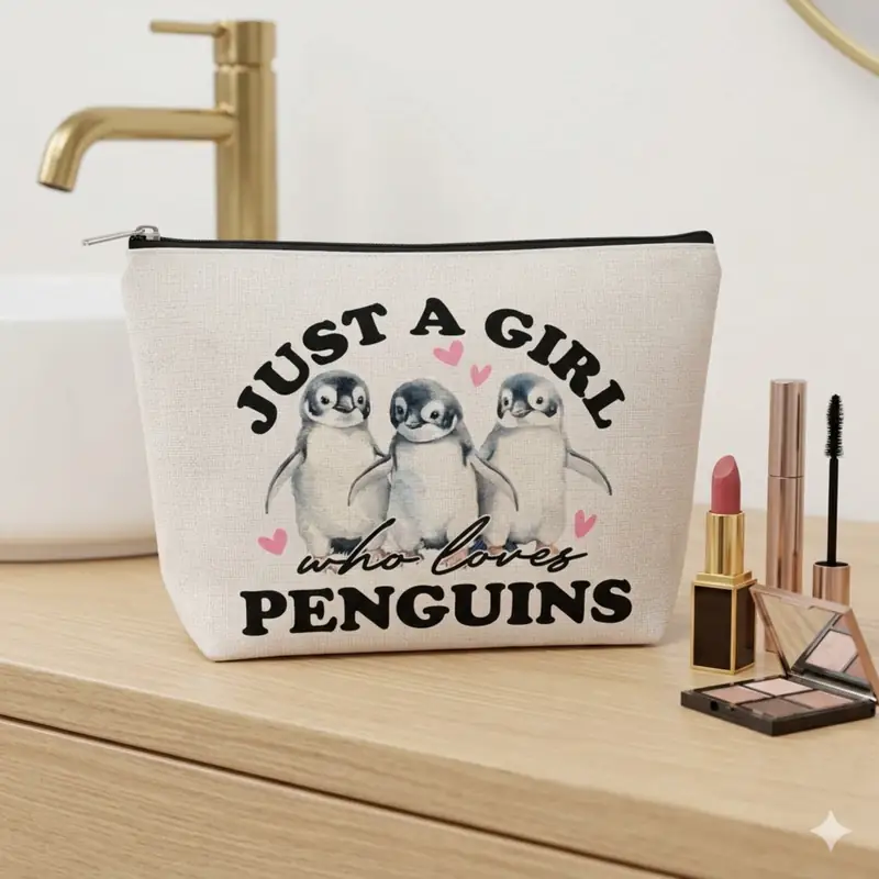 La scritta Just a Girl Who Loves Penguins completa perfettamente il design, perché racconta in modo diretto una passione precisa. Non si tratta quindi di un semplice beauty case con animali, ma di una pochette a tema pinguini pensata per chi ama questo soggetto e vuole un accessorio che lo rappresenti subito. Proprio per questo può funzionare molto bene anche come regalo.