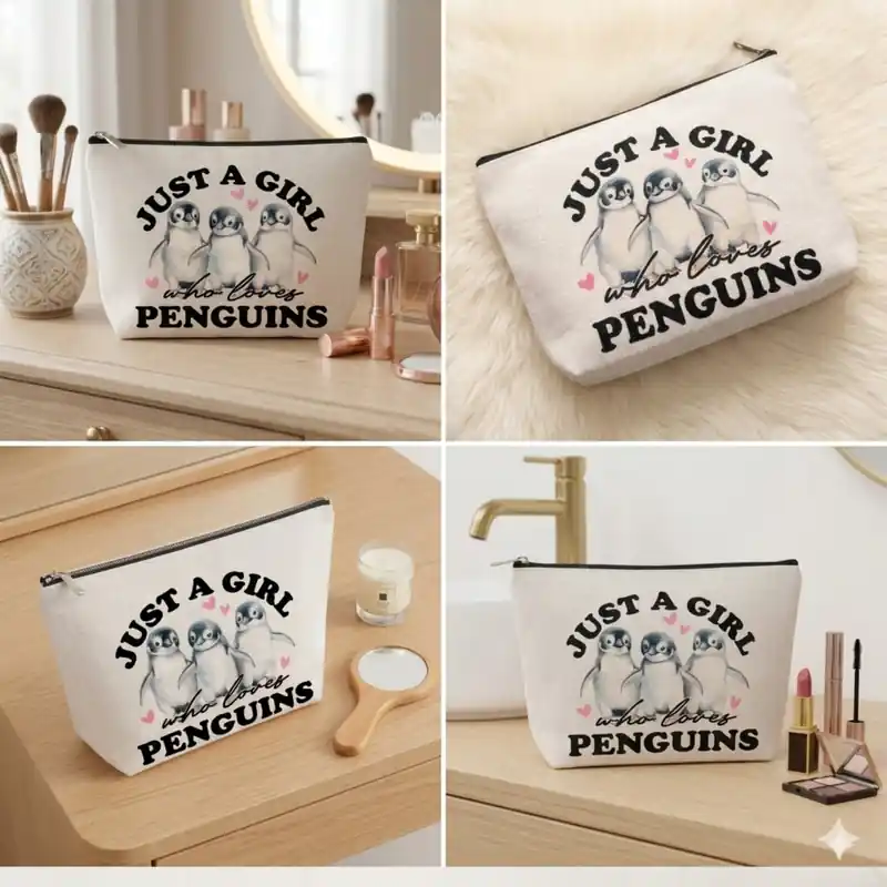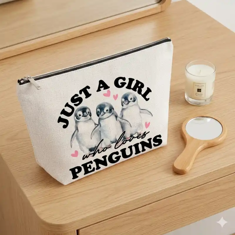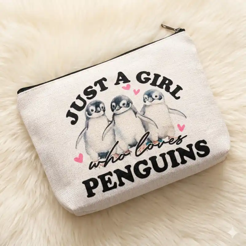 Questa pochette Just a Girl Who Loves Penguins è anche un’ottima idea regalo per chi ama i pinguini, perché unisce utilità e messaggio in modo semplice e immediato.