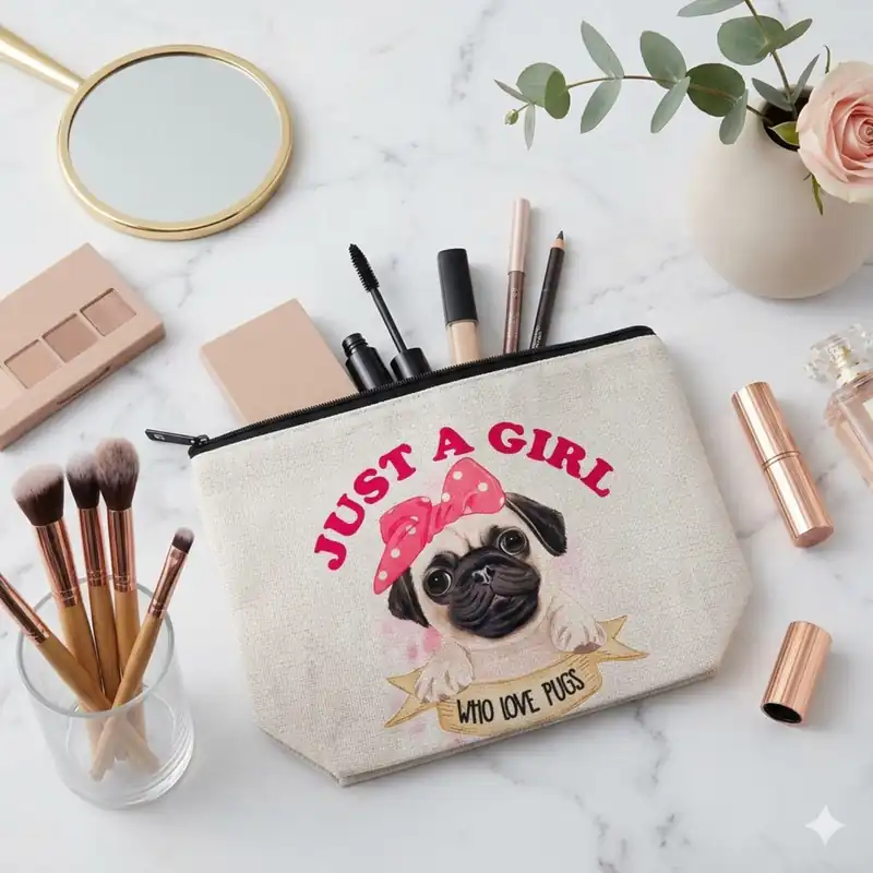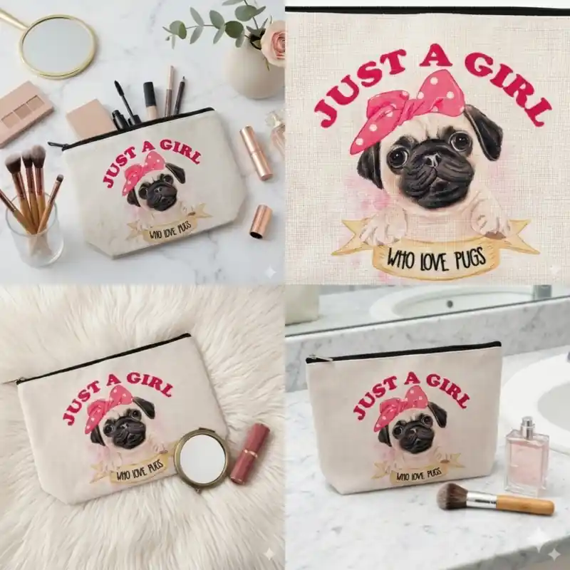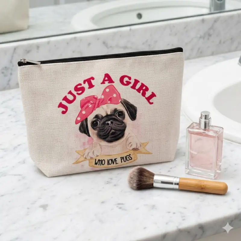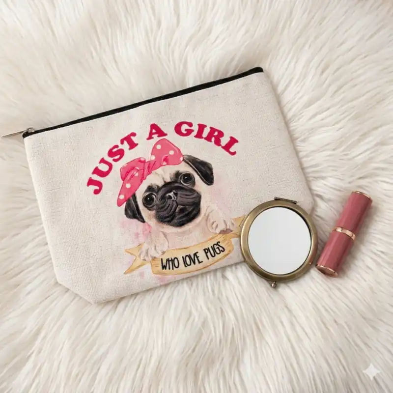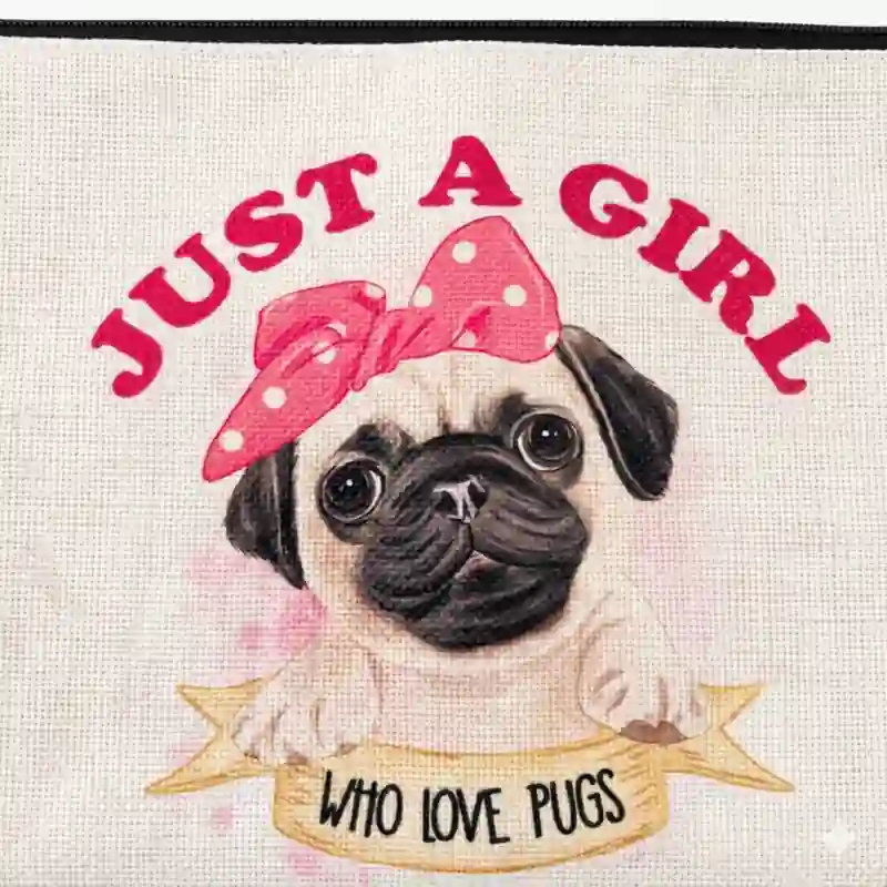 La pochette Just a Girl Who Loves Pugs è anche un’ottima idea regalo per amanti dei carlini, perché unisce funzione e messaggio in modo immediato.