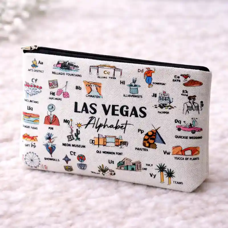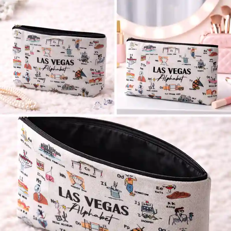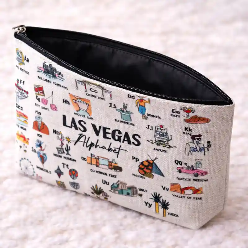 Questa pochette Las Vegas si distingue per una grafica ricca e creativa, costruita attorno al tema Las Vegas Alphabet. La stampa dà al prodotto un’identità visiva precisa e lo rende più decorativo rispetto a una normale pochette con fantasia generica.