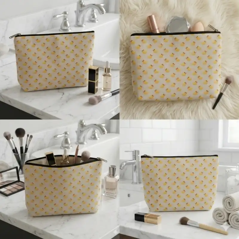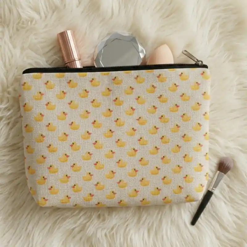 Dal punto di vista cromatico, la combinazione funziona molto bene: il fondo chiaro valorizza i toni gialli delle paperelle e mette in risalto anche i piccoli dettagli aranciati del becco. Il risultato è una grafica luminosa, delicata e facile da abbinare, adatta a chi cerca una pochette con paperelle dal look dolce ma semplice.