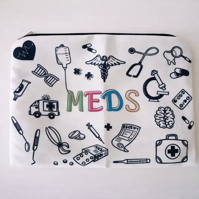 Questa pochette per medicine di colore bianco si distingue subito per la sua grafica a tema medico, costruita attorno alla scritta centrale MEDS e a una serie di illustrazioni e icone sanitarie distribuite su tutta la superficie. Non è una semplice pochette decorativa, ma un accessorio con un’identità visiva chiara, pensato per chi cerca un design originale.