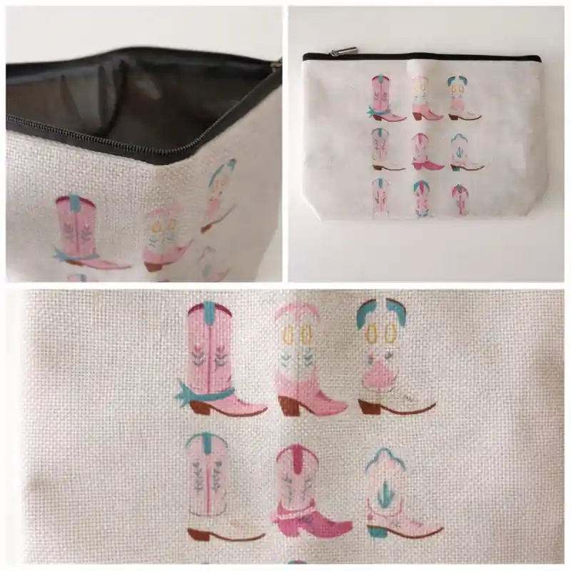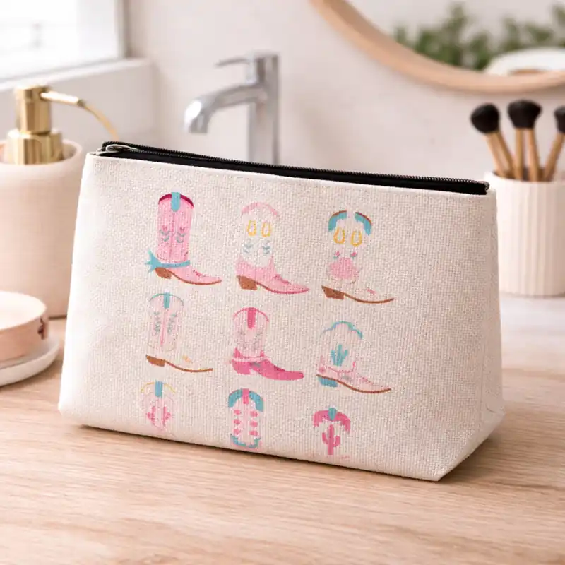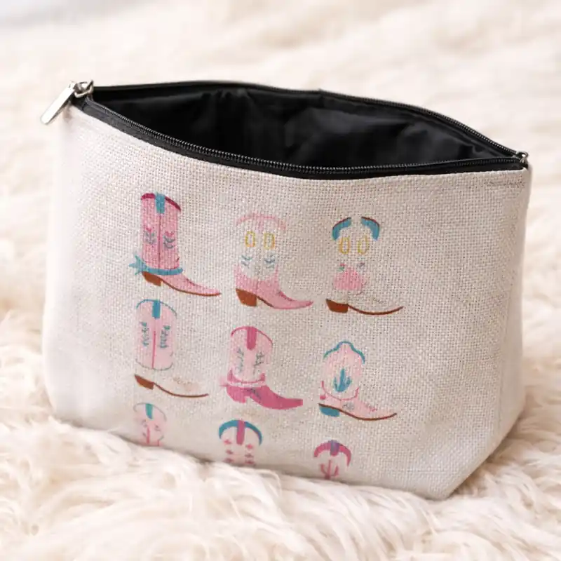 Questa pochette con fantasia western ha un’identità visiva molto precisa: richiama il mondo western, ma lo fa con toni morbidi e decorativi, lontani dall’estetica ruvida del classico cowgirl style. La stampa con stivaletti cowboy-cowgirl colorati rende il prodotto subito riconoscibile e gli dà un carattere più giocoso, contemporaneo e femminile.
