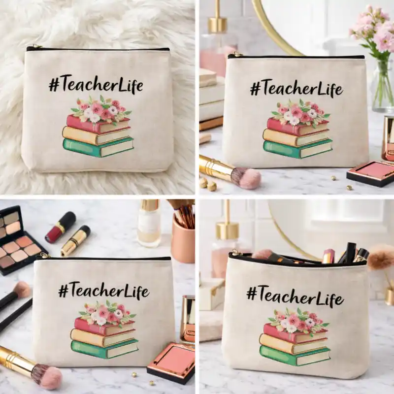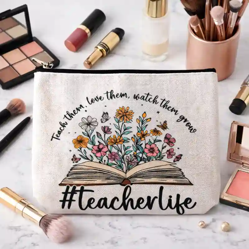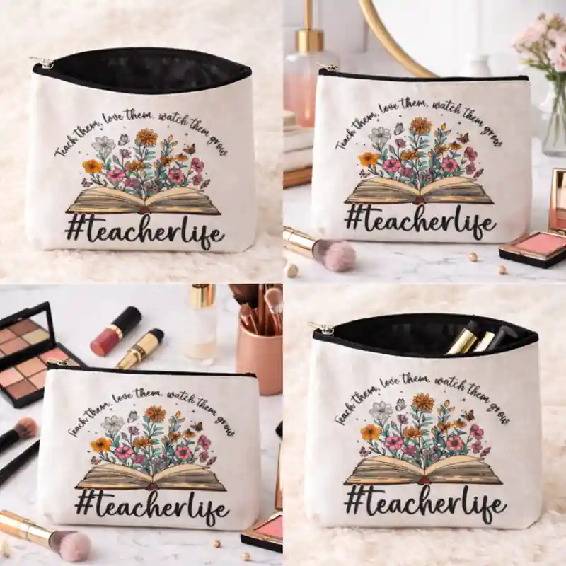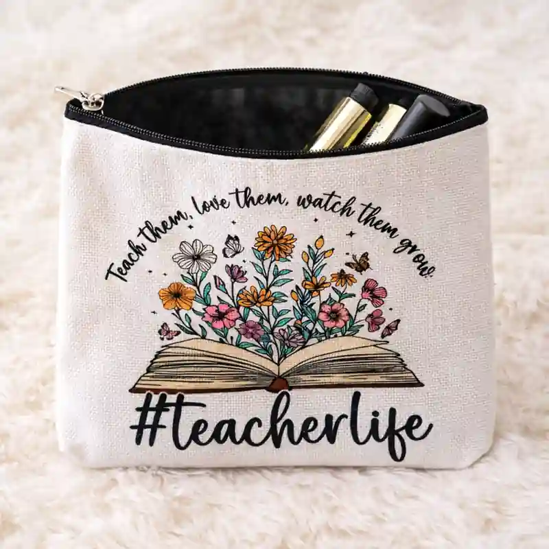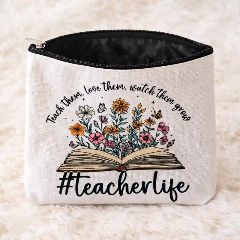 Questa pochette dedicata a chi insegna si distingue subito per la sua grafica frontale costruita attorno al mondo dell’insegnamento. Al centro compare un libro aperto da cui nascono fiori colorati e piccole farfalle, accompagnato dalla frase Teach them. Love them. Watch them grow (Insegna loro. Amali. Guardali crescere )e dalla scritta grande #Teacherlife (vita da insegnante). Si tratta di un accessorio pensato come rinraziamento per chi svolge il lavoro educativo.