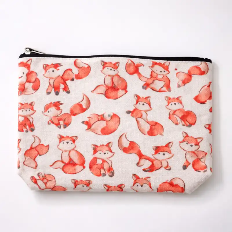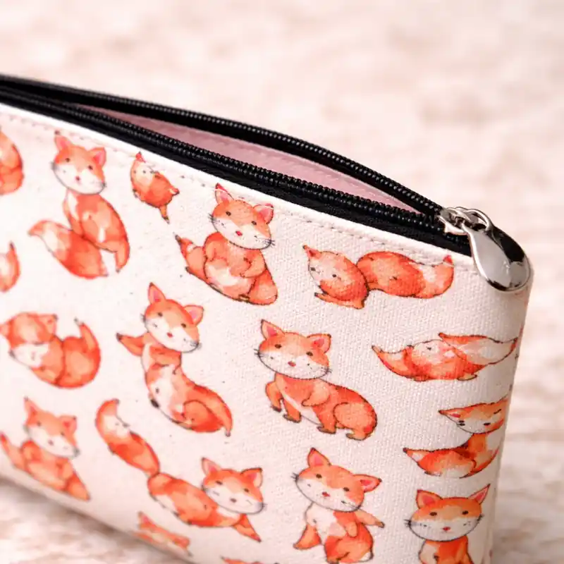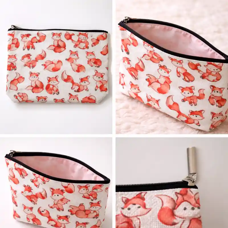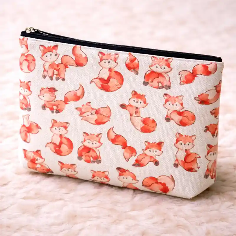 Questa pochette si distingue subito per la sua fantasia illustrata con la volpe ripetute su tutta la superficie. Non si tratta di una semplice stampa decorativa generica, ma di una grafica all-over molto riconoscibile, composta da piccole volpi in pose diverse che rendono il prodotto immediatamente più tenero, vivace e personale rispetto a una classica trousse tinta unita.