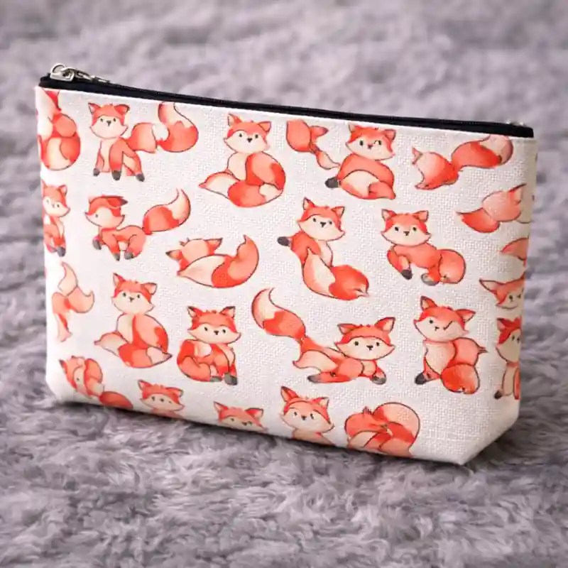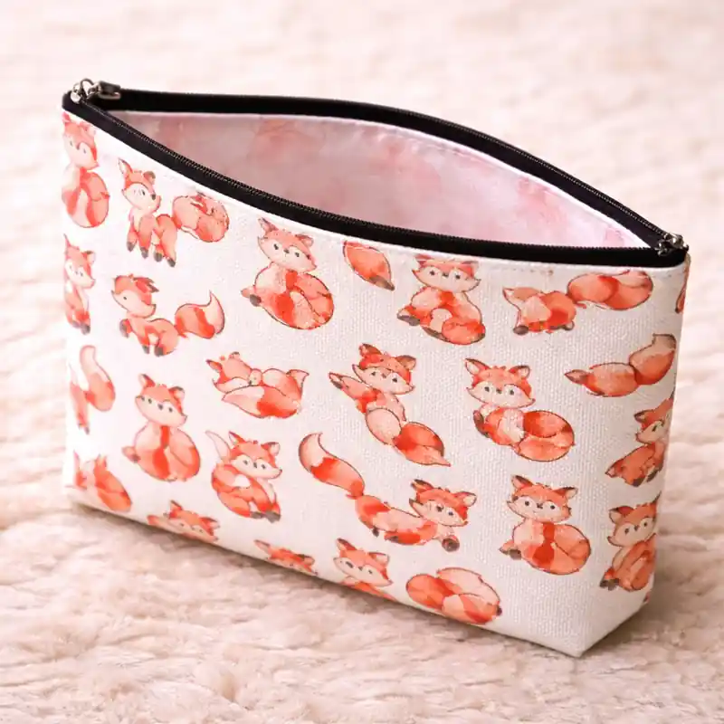 Dal punto di vista visivo, il contrasto tra il fondo bianco e le tonalità calde del manto delle volpi crea una grafica luminosa e piacevole. I colori aranciati e rosati danno movimento alla fantasia e rendono questa pochette con volpi adatta a chi cerca un accessorio decorativo ma facile da abbinare. La zip nera nella parte superiore definisce bene il profilo del beauty case e aggiunge un piccolo contrasto che rende il design ancora più pulito.