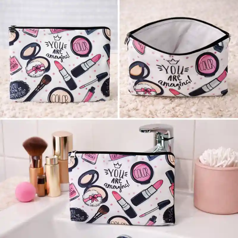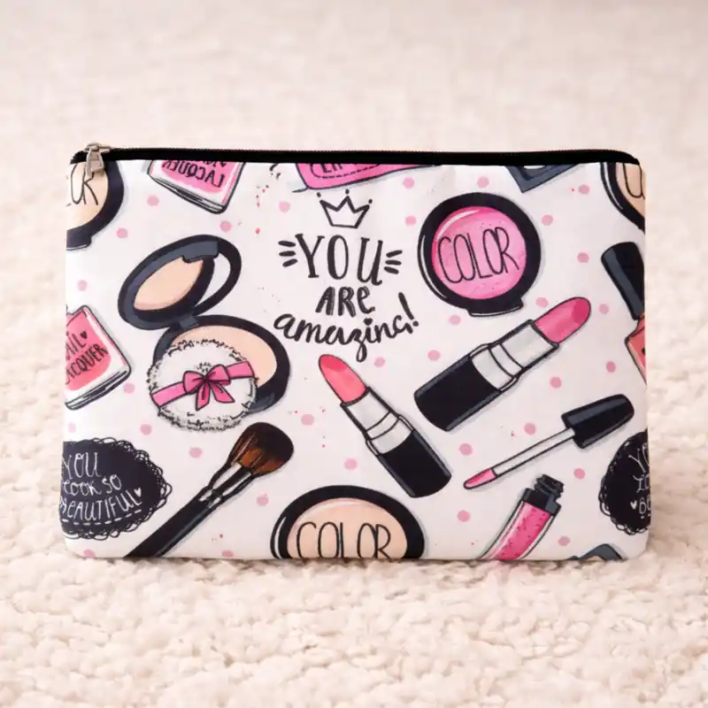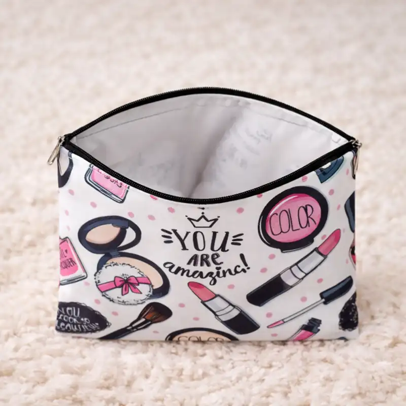 Questa pochette si distingue perché unisce in modo molto chiaro il mondo beauty e un messaggio positivo e incoraggiante. La frase You Are Amazing! è il centro visivo del design e rende subito la pochette più personale e immediata rispetto a una semplice fantasia make up. Non è quindi solo una trousse con cosmetici illustrati, ma un accessorio che comunica energia, autostima e stile femminile.