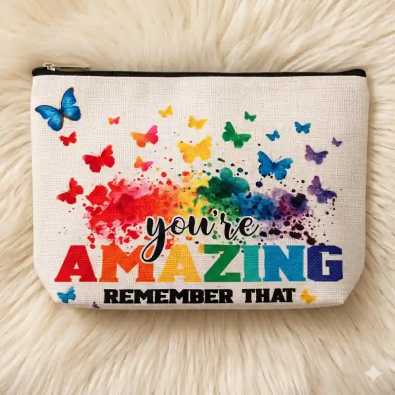 Questa pochette con messaggi opositivo si distingue subito per la sua grafica frontale costruita attorno a un messaggio chiaro e incoraggiante: you’re AMAZING – REMEMBER THAT (sei fantastica, ricordatelo). Si tratta di un accessorio pensato per trasmettere energia positiva e autostima attraverso un design vivace e facilmente riconoscibile.