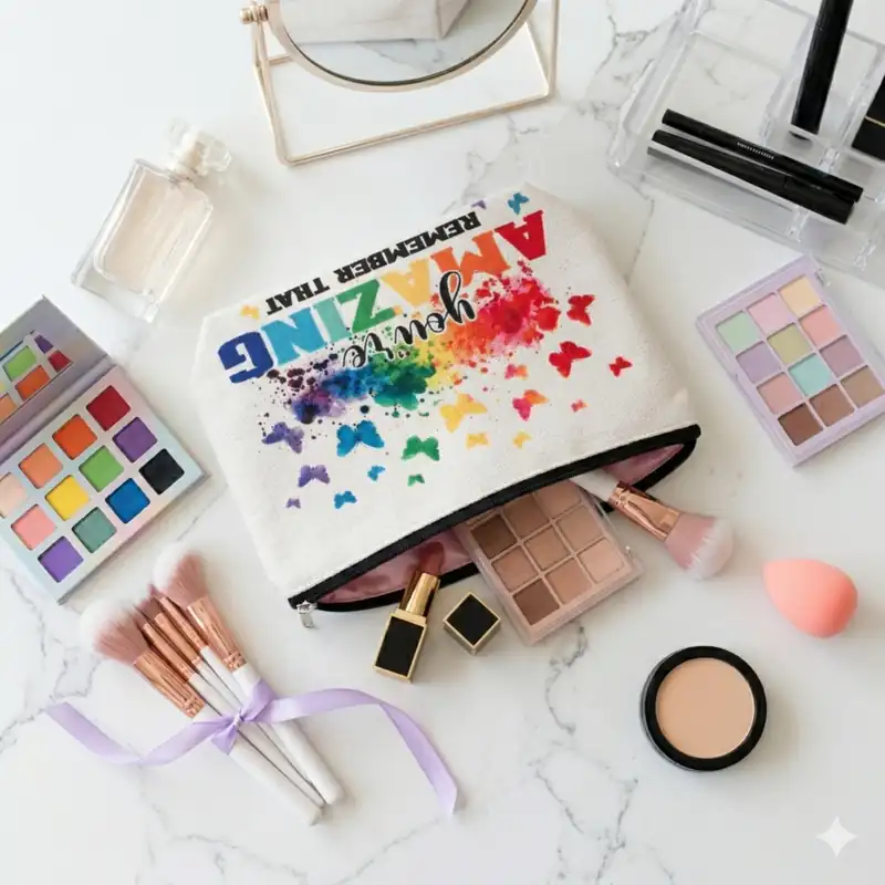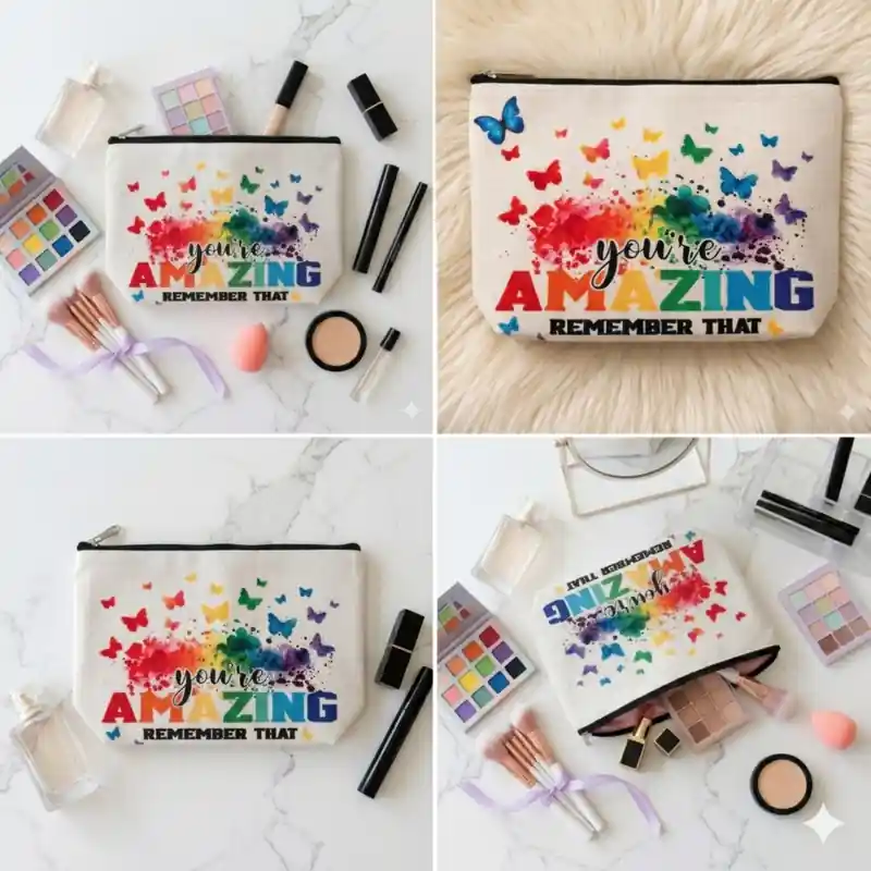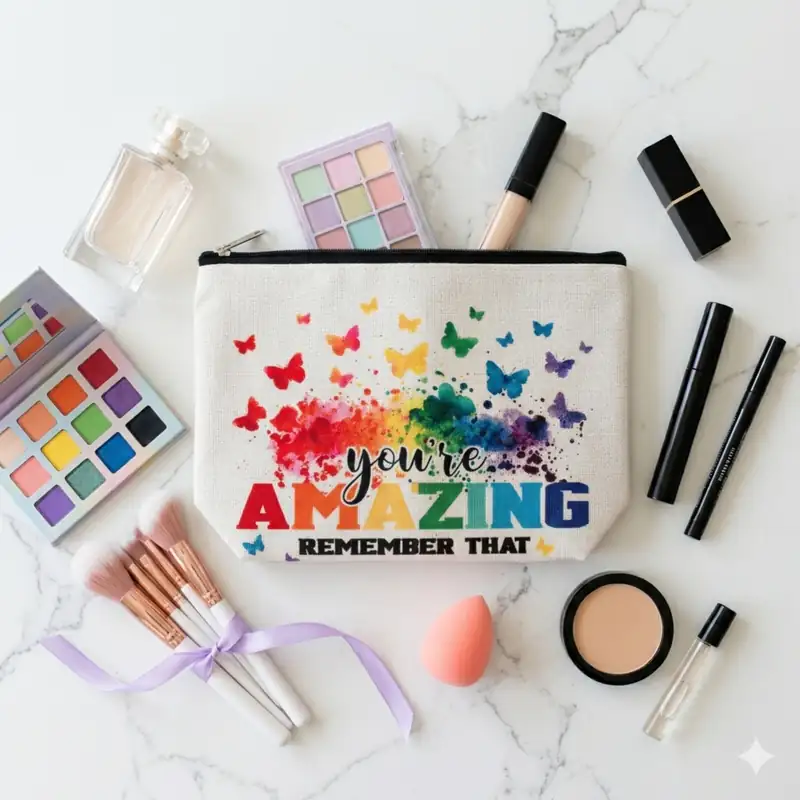 Le farfalle colorate e l’effetto acquerello arcobaleno aggiungono anche un significato simbolico: leggerezza, trasformazione, energia e positività. Per questo è particolarmente adatta a chi ama accessori allegri, a chi cerca una trousse dal tono incoraggiante o a chi vuole fare un regalo con un messaggio bello e immediato.
